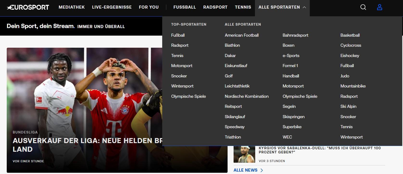2025年9月3日欧洲体育台官网主页截图 图片来源:www.eurosport.com