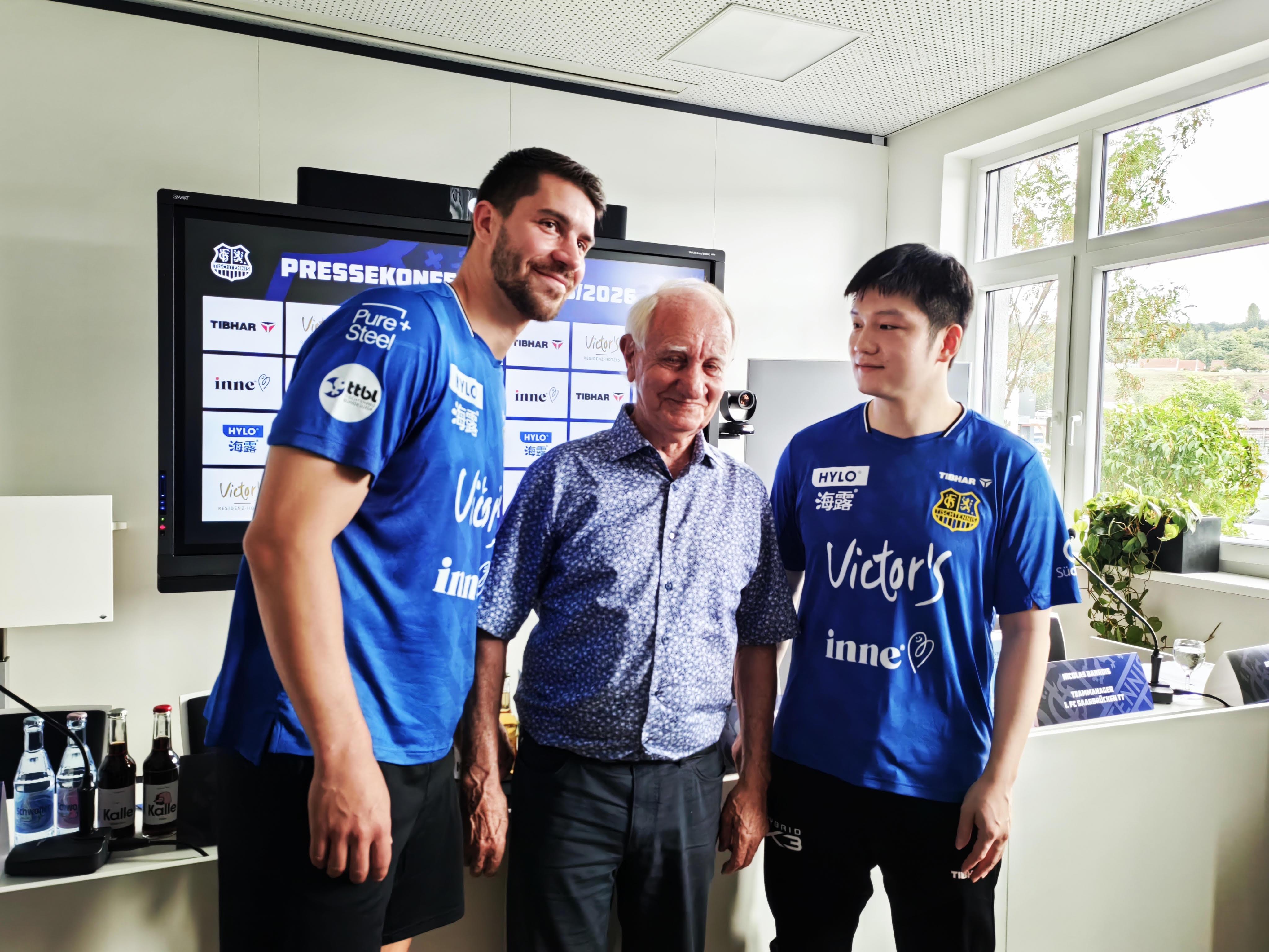 弗朗西斯卡、樊振东与前萨尔布吕肯俱乐部运动员贝格先生合影 ©Helen